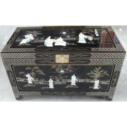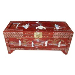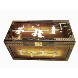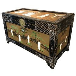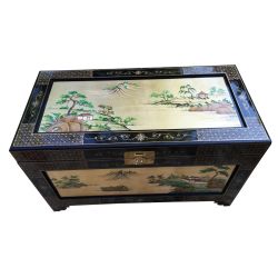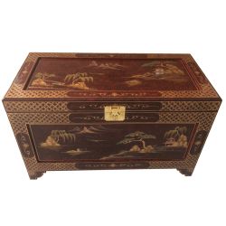 Mise en valeur : placez le coffre près d’une source de lumière naturelle ou sous un éclairage doux pour souligner les reflets de la laque et les détails artisanaux.