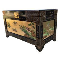 Les coffres laqués de La Baie d’Halong incarnent un héritage artisanal asiatique millénaire, alliant techniques traditionnelles et matériaux nobles. Fabriqués en bois d’acacia massif, ces coffres subissent un processus minutieux : ponçage méticuleux, application de couches successives de laque naturelle issue de résine végétale, puis décoration manuelle par des artisans expérimentés. Les motifs, inspirés des dynasties chinoises Ming et Qing, incluent des scènes naturalistes (bambous, fleurs de lotus), des symboles porte-bonheur (dragons, phénix) ou des entrelacs géométriques, rehaussés par des incrustations de nacre ou des dorures à la feuille pour des modèles d’exception. La laque confère une finition brillante, résistante aux chocs et à l’humidité, idéale pour un mobilier à la fois esthétique et durable.